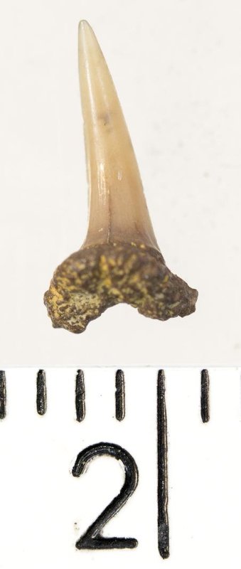 Мелкий боковой зуб с коронкой рыжевато-бежевого цвета, колюще-режущего типа, S-образно изогнутой, с гладким режущим краем. С лингвальной стороны у основания коронки на эмали имеется скульптура в виде слабой продольной струйчатости. Корень бурый, арочный, умеренно массивный, со следами окатанности. Имеется одна питательная борозда с лингвальной стороны корня. Добавочные зубцы коронки зуба отсутствуют.