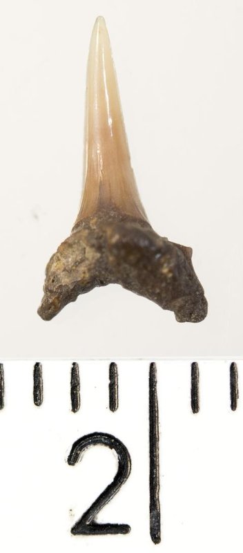 Мелкий боковой зуб с коронкой рыжевато-бежевого цвета, колюще-режущего типа, S-образно изогнутой, с гладким режущим краем. С лингвальной стороны у основания коронки на эмали имеется скульптура в виде слабой продольной струйчатости. Корень бурый, арочный, умеренно массивный, со следами окатанности. Имеется одна питательная борозда с лингвальной стороны корня. Добавочные зубцы коронки зуба отсутствуют.