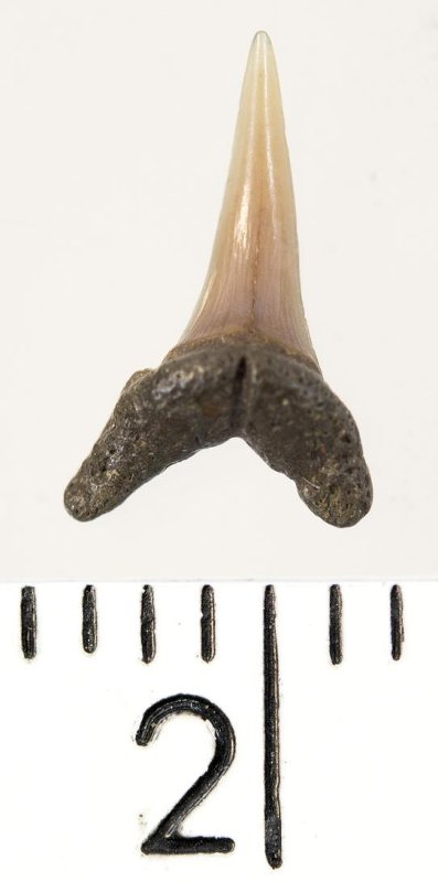 Мелкий боковой зуб с коронкой рыжевато-бежевого цвета, колюще-режущего типа, S-образно изогнутой, с гладким режущим краем. С лингвальной стороны у основания коронки на эмали имеется скульптура в виде слабой продольной струйчатости. Корень бурый, арочный, умеренно массивный, со следами окатанности. Имеется одна питательная борозда с лингвальной стороны корня. Добавочные зубцы коронки зуба отсутствуют.