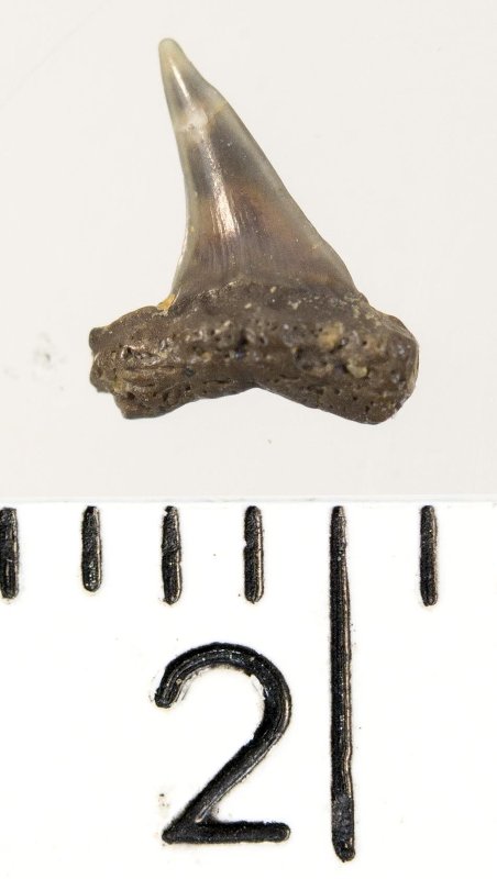 Зуб. Акула. Eostriatolamia subulata (Agassiz, 1843). Классификация: Хордовые Chordata, Позвоночные Vertebrata, Хрящевые рыбы Chondrichthyes, Пластиножаберные Elasmobranchii, Акулы Selachii, Ламнообразные Lamniformes, Песчаные акулы Odontaspididae
