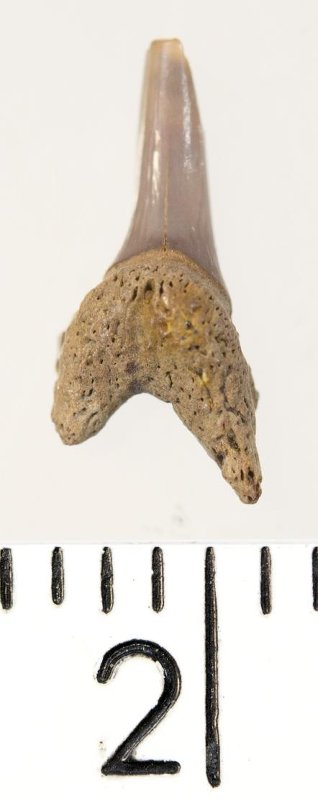 Мелкий боковой зуб с коронкой рыжевато-бежевого цвета, колюще-режущего типа, S-образно изогнутой, с гладким режущим краем. С лингвальной стороны у основания коронки на эмали имеется скульптура в виде слабой продольной струйчатости. Корень бурый, арочный, умеренно массивный, со следами окатанности. Имеется одна питательная борозда с лингвальной стороны корня. Добавочные зубцы коронки зуба отсутствуют.