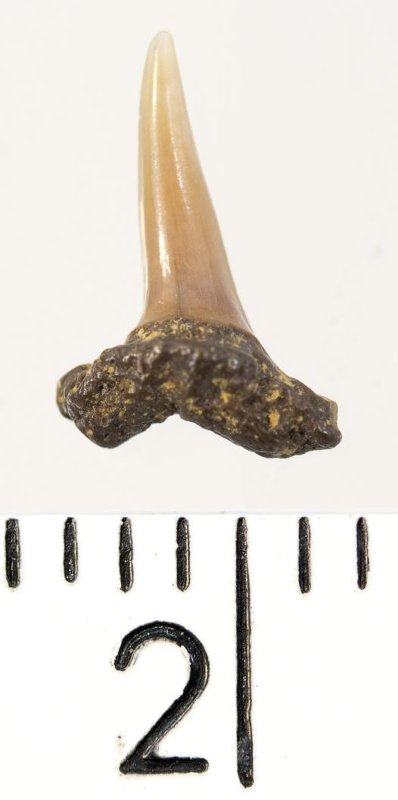 Мелкий боковой зуб с коронкой рыжевато-бежевого цвета, колюще-режущего типа, S-образно изогнутой, с гладким режущим краем. С лингвальной стороны у основания коронки на эмали имеется скульптура в виде слабой продольной струйчатости. Корень бурый, арочный, умеренно массивный, со следами окатанности. Имеется одна питательная борозда с лингвальной стороны корня. Добавочные зубцы коронки зуба отсутствуют.