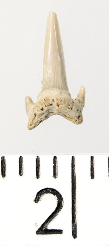 Мелкий боковой зуб с коронкой серого цвета, колюще-режущего типа, S-образно изогнутой, с гладким режущим краем. С лингвальной стороны у основания коронки на эмали имеется скульптура в виде слабой продольной струйчатости. Корень охристый, арочный, умеренно массивный, со следами окатанности. Имеются питательная борозда с лингвальной стороны корня и одна пара добавочных зубцов коронки.