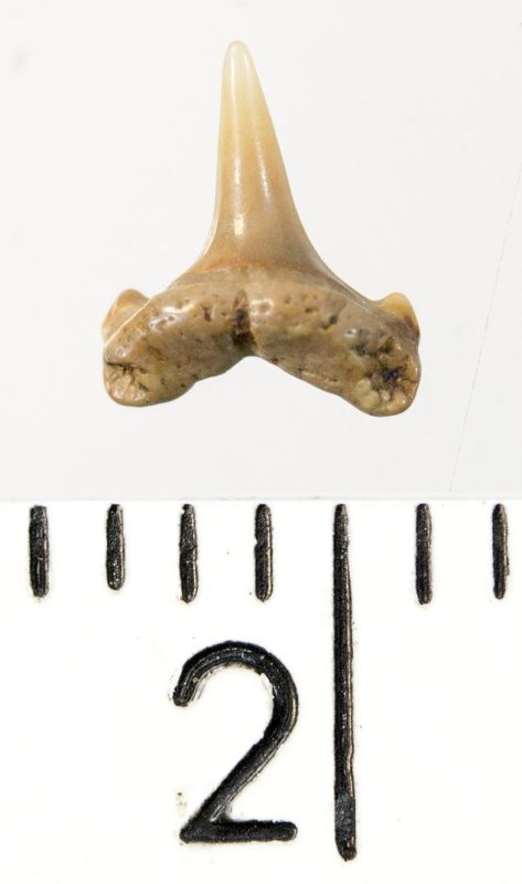 Мелкий боковой зуб с коронкой серого цвета, колюще-режущего типа, S-образно изогнутой, с гладким режущим краем. С лингвальной стороны у основания коронки на эмали имеется скульптура в виде слабой продольной струйчатости. Корень охристый, арочный, умеренно массивный, со следами окатанности. Имеются питательная борозда с лингвальной стороны корня и одна пара добавочных зубцов коронки.