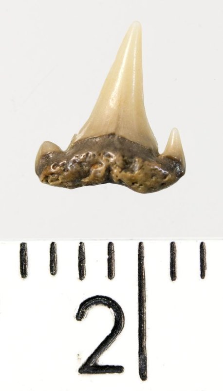 Мелкий боковой зуб с коронкой серого цвета, колюще-режущего типа, S-образно изогнутой, с гладким режущим краем. С лингвальной стороны у основания коронки на эмали имеется скульптура в виде слабой продольной струйчатости. Корень охристый, арочный, умеренно массивный, со следами окатанности. Имеются питательная борозда с лингвальной стороны корня и одна пара добавочных зубцов коронки.