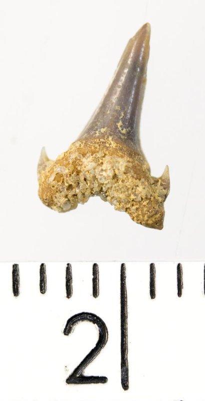 Мелкий боковой зуб с коронкой серого цвета, колюще-режущего типа, S-образно изогнутой, с гладким режущим краем. С лингвальной стороны у основания коронки на эмали имеется скульптура в виде слабой продольной струйчатости. Корень охристый, арочный, умеренно массивный, со следами окатанности. Имеются питательная борозда с лингвальной стороны корня и одна пара добавочных зубцов коронки.