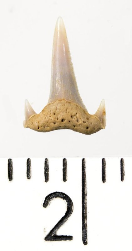 Мелкий боковой зуб с коронкой серого цвета, колюще-режущего типа, S-образно изогнутой, с гладким режущим краем. С лингвальной стороны у основания коронки на эмали имеется скульптура в виде слабой продольной струйчатости. Корень охристый, арочный, умеренно массивный, со следами окатанности. Имеются питательная борозда с лингвальной стороны корня и одна пара добавочных зубцов коронки.
