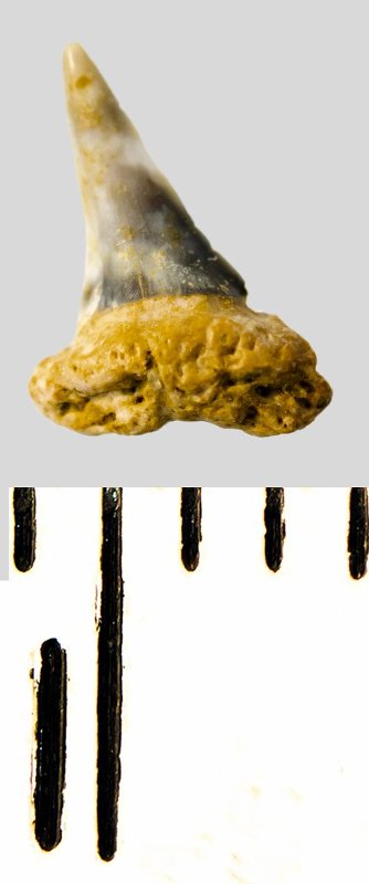 Зуб (фрагмент). Акула. Lamniformes gen. indet. Классификация: Хордовые Chordata, Позвоночные Vertebrata, Хрящевые рыбы Chondrichthyes, Пластиножаберные Elasmobranchii, Акулы Selachii, Ламнообразные Lamniformes