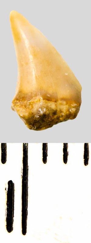 Средних размеров боковой зуб с коронкой серого цвета, режущего типа, S-образно изогнутой, без скульптуры, с гладким режущим краем. Корень охристый, арочный, с V-образным вырезом между ветвями, умеренно массивный, со следами окатанности. Имеется одно питательное отверстие с лингвальной стороны корня. Имелась одна пара добавочных зубцов коронки, сохранился только правый.