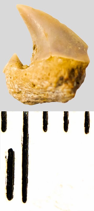 Средних размеров боковой зуб с коронкой серого цвета, режущего типа, S-образно изогнутой, без скульптуры, с гладким режущим краем. Корень охристый, арочный, с V-образным вырезом между ветвями, умеренно массивный, со следами окатанности. Имеется одно питательное отверстие с лингвальной стороны корня. Имелась одна пара добавочных зубцов коронки, сохранился только правый.