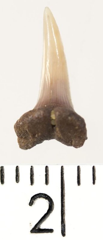 Мелкий боковой зуб с коронкой рыжевато-бежевого цвета, колюще-режущего типа, S-образно изогнутой, с гладким режущим краем. С лингвальной стороны у основания коронки на эмали имеется скульптура в виде слабой продольной струйчатости. Корень бурый, арочный, умеренно массивный, со следами окатанности. Имеется одна питательная борозда с лингвальной стороны корня. Добавочные зубцы коронки зуба отсутствуют.