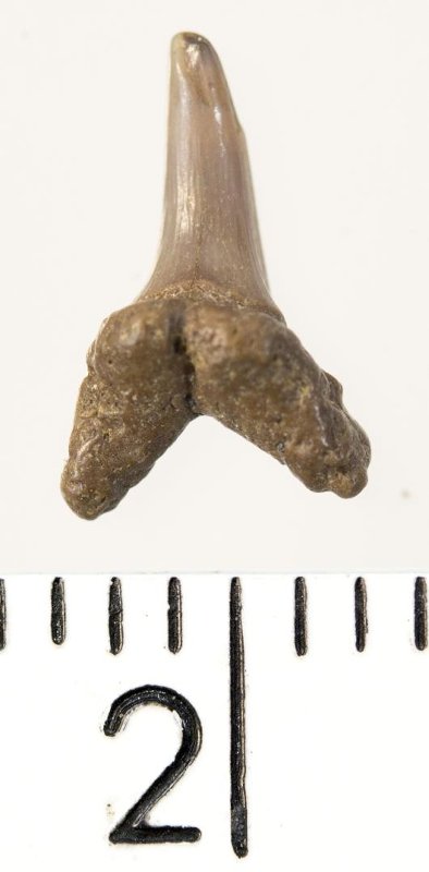 Мелкий боковой зуб с коронкой рыжевато-бежевого цвета, колюще-режущего типа, S-образно изогнутой, с гладким режущим краем. С лингвальной стороны у основания коронки на эмали имеется скульптура в виде слабой продольной струйчатости. Корень бурый, арочный, умеренно массивный, со следами окатанности. Имеется одна питательная борозда с лингвальной стороны корня. Добавочные зубцы коронки зуба отсутствуют.