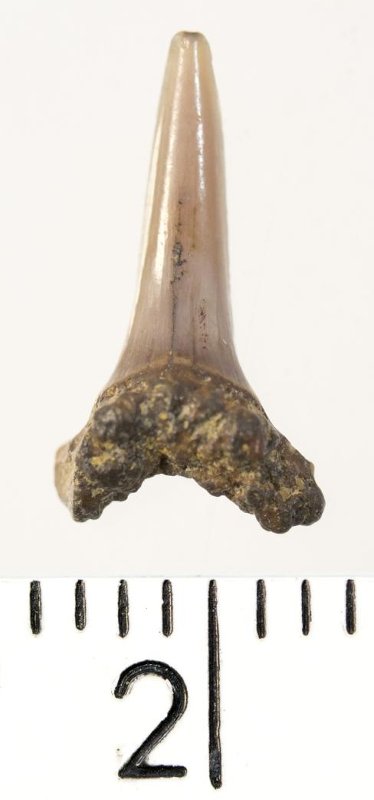 Мелкий боковой зуб с коронкой рыжевато-бежевого цвета, колюще-режущего типа, S-образно изогнутой, с гладким режущим краем. С лингвальной стороны у основания коронки на эмали имеется скульптура в виде слабой продольной струйчатости. Корень бурый, арочный, умеренно массивный, со следами окатанности. Имеется одна питательная борозда с лингвальной стороны корня. Добавочные зубцы коронки зуба отсутствуют.