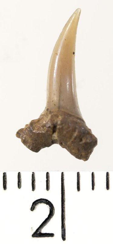 Мелкий боковой зуб с коронкой рыжевато-бежевого цвета, колюще-режущего типа, S-образно изогнутой, с гладким режущим краем. С лингвальной стороны у основания коронки на эмали имеется скульптура в виде слабой продольной струйчатости. Корень бурый, арочный, умеренно массивный, со следами окатанности. Имеется одна питательная борозда с лингвальной стороны корня. Добавочные зубцы коронки зуба отсутствуют.