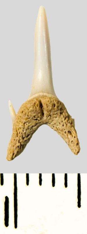 Мелкий боковой зуб с коронкой светло-серого цвета, колюще-режущего типа, S-образно изогнутой, с гладким режущим краем. Корень серо-кремового цвета, арочный, умеренно массивный, со следами окатанности. Имеется одна питательная борозда с лингвальной стороны корня. Имелась одна пара добавочных зубцов коронки, сохранился только левый.