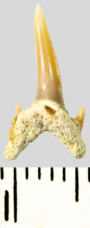 Мелкий передне-боковой (?) зуб с коронкой кремового цвета, колюще-режущего типа, S-образно изогнутой, с гладким режущим краем. Корень сливочного цвета, арочный, умеренно массивный, со следами окатанности. Имеется одна питательная борозда с лингвальной стороны корня. Имеется одна пара добавочных зубцов коронки.