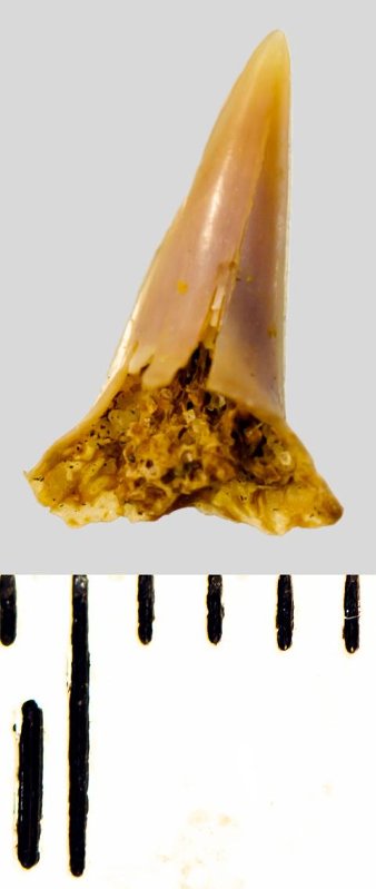 Зуб (фрагмент). Акула. Eostriatolamia subulata (Agassiz, 1843). Классификация: Хордовые Chordata, Позвоночные Vertebrata, Хрящевые рыбы Chondrichthyes, Пластиножаберные Elasmobranchii, Акулы Selachii, Ламнообразные Lamniformes, Песчаные акулы Odontaspididae