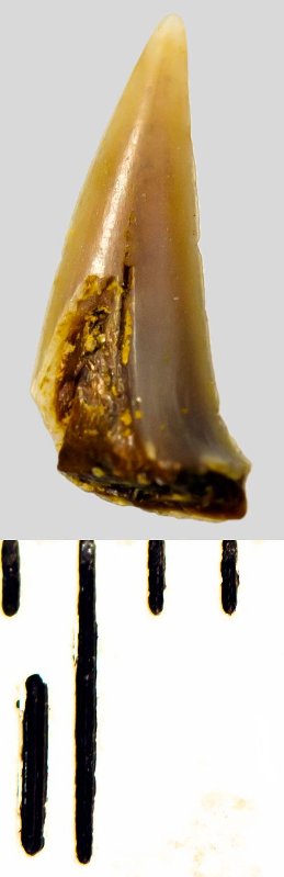 Мелкий боковой зуб с коронкой охристого цвета, колюще-режущего типа, S-образно изогнутой, с гладким режущим краем. С лингвальной стороны у основания коронки на эмали имеется скульптура в виде слабой продольной струйчатости. Корень темно-охристый, арочный, умеренно массивный, со следами окатанности и повреждениями. Имеется одна питательная борозда с лингвальной стороны корня. Имелась одна пара добавочных зубцов коронки, сохранился только правый.
