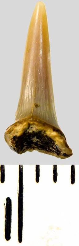Мелкий боковой зуб с коронкой охристого цвета, колюще-режущего типа, S-образно изогнутой, с гладким режущим краем. С лингвальной стороны у основания коронки на эмали имеется скульптура в виде слабой продольной струйчатости. Корень темно-охристый, арочный, умеренно массивный, со следами окатанности и повреждениями. Имеется одна питательная борозда с лингвальной стороны корня. Имелась одна пара добавочных зубцов коронки, сохранился только правый.
