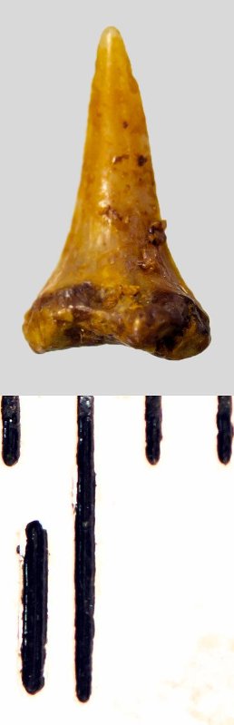 Зуб (фрагмент). Акула. Eostriatolamia subulata (Agassiz, 1843). Классификация: Хордовые Chordata, Позвоночные Vertebrata, Хрящевые рыбы Chondrichthyes, Пластиножаберные Elasmobranchii, Акулы Selachii, Ламнообразные Lamniformes, Песчаные акулы Odontaspididae