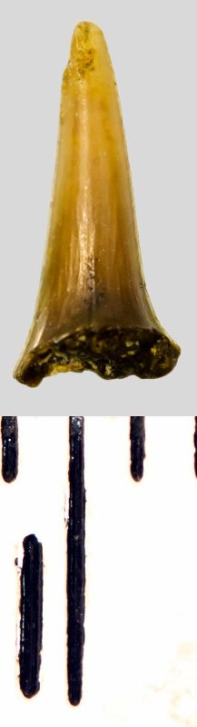 Мелкий боковой зуб с коронкой охристого цвета, колюще-режущего типа, S-образно изогнутой, с гладким режущим краем. С лингвальной стороны у основания коронки на эмали имеется скульптура в виде слабой продольной струйчатости. Корень темно-охристый, арочный, умеренно массивный, со следами окатанности и повреждениями. Имеется одна питательная борозда с лингвальной стороны корня. Имелась одна пара добавочных зубцов коронки, сохранился только правый.