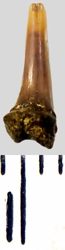 Мелкий боковой зуб с коронкой охристого цвета, колюще-режущего типа, S-образно изогнутой, с гладким режущим краем. С лингвальной стороны у основания коронки на эмали имеется скульптура в виде слабой продольной струйчатости. Корень темно-охристый, арочный, умеренно массивный, со следами окатанности и повреждениями. Имеется одна питательная борозда с лингвальной стороны корня. Имелась одна пара добавочных зубцов коронки, сохранился только правый.