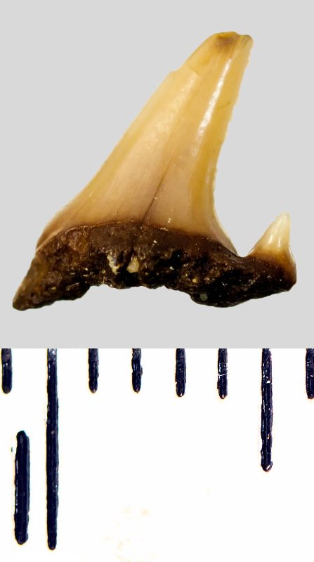 Зуб (фрагмент). Акула. Eostriatolamia subulata (Agassiz, 1843). Классификация: Хордовые Chordata, Позвоночные Vertebrata, Хрящевые рыбы Chondrichthyes, Пластиножаберные Elasmobranchii, Акулы Selachii, Ламнообразные Lamniformes, Песчаные акулы Odontaspididae
