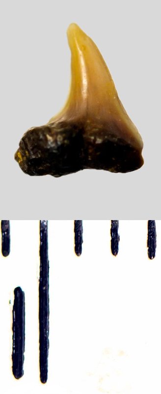 Зуб (фрагмент). Акула. Eostriatolamia subulata (Agassiz, 1843). Классификация: Хордовые Chordata, Позвоночные Vertebrata, Хрящевые рыбы Chondrichthyes, Пластиножаберные Elasmobranchii, Акулы Selachii, Ламнообразные Lamniformes, Песчаные акулы Odontaspididae