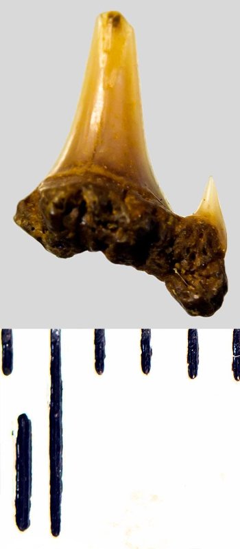 Мелкий боковой зуб с коронкой охристого цвета, колюще-режущего типа, S-образно изогнутой, с гладким режущим краем. С лингвальной стороны у основания коронки на эмали имеется скульптура в виде слабой продольной струйчатости. Корень темно-охристый, арочный, умеренно массивный, со следами окатанности и повреждениями. Имеется одна питательная борозда с лингвальной стороны корня. Имелась одна пара добавочных зубцов коронки, сохранился только правый.