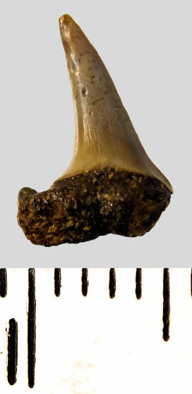 Мелкий боковой зуб с коронкой рыжевато-бежевого цвета, колюще-режущего типа, S-образно изогнутой, с гладким режущим краем. С лингвальной стороны у основания коронки на эмали имеется скульптура в виде слабой продольной струйчатости. Корень охристый, арочный, умеренно массивный, со следами окатанности, правая ветвь утрачена. Имеется одна питательная борозда с лингвальной стороны корня. Имелась одна пара добавочных зубцов коронки, сохранился только левый.