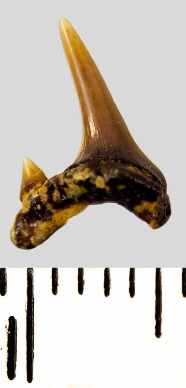 Мелкий боковой зуб с коронкой рыжевато-бежевого цвета, колюще-режущего типа, S-образно изогнутой, с гладким режущим краем. С лингвальной стороны у основания коронки на эмали имеется скульптура в виде слабой продольной струйчатости. Корень охристый, арочный, умеренно массивный, со следами окатанности, правая ветвь утрачена. Имеется одна питательная борозда с лингвальной стороны корня. Имелась одна пара добавочных зубцов коронки, сохранился только левый.