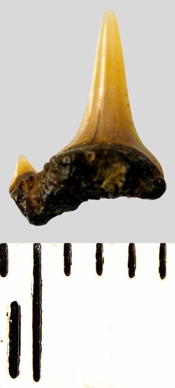 Мелкий боковой зуб с коронкой рыжевато-бежевого цвета, колюще-режущего типа, S-образно изогнутой, с гладким режущим краем. С лингвальной стороны у основания коронки на эмали имеется скульптура в виде слабой продольной струйчатости. Корень охристый, арочный, умеренно массивный, со следами окатанности, правая ветвь утрачена. Имеется одна питательная борозда с лингвальной стороны корня. Имелась одна пара добавочных зубцов коронки, сохранился только левый.