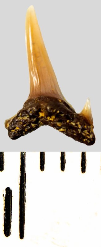 Мелкий боковой зуб с коронкой темно-бежевого цвета, колюще-режущего типа, S-образно изогнутой, с гладким режущим краем. С лингвальной стороны у основания коронки на эмали имеется скульптура в виде слабой продольной струйчатости. Корень бурый, арочный, умеренно массивный, со следами окатанности. Имеется одна питательная борозда с лингвальной стороны корня. Имелась одна пара добавочных зубцов коронки, сохранился только правый.