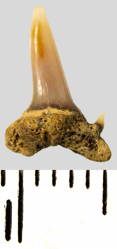 Мелкий боковой зуб с коронкой темно-бежевого цвета, колюще-режущего типа, S-образно изогнутой, с гладким режущим краем. С лингвальной стороны у основания коронки на эмали имеется скульптура в виде слабой продольной струйчатости. Корень бурый, арочный, умеренно массивный, со следами окатанности. Имеется одна питательная борозда с лингвальной стороны корня. Имелась одна пара добавочных зубцов коронки, сохранился только правый.