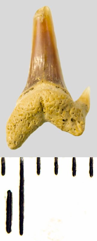 Мелкий боковой зуб с коронкой темно-бежевого цвета, колюще-режущего типа, S-образно изогнутой, с гладким режущим краем. С лингвальной стороны у основания коронки на эмали имеется скульптура в виде слабой продольной струйчатости. Корень бурый, арочный, умеренно массивный, со следами окатанности. Имеется одна питательная борозда с лингвальной стороны корня. Имелась одна пара добавочных зубцов коронки, сохранился только правый.