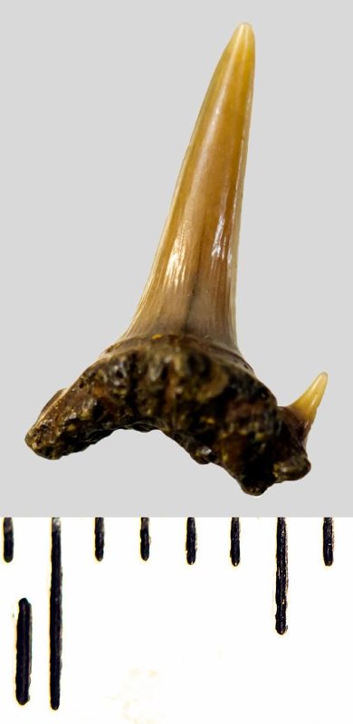 Мелкий боковой зуб с коронкой темно-бежевого цвета, колюще-режущего типа, S-образно изогнутой, с гладким режущим краем. С лингвальной стороны у основания коронки на эмали имеется скульптура в виде слабой продольной струйчатости. Корень бурый, арочный, умеренно массивный, со следами окатанности. Имеется одна питательная борозда с лингвальной стороны корня. Имелась одна пара добавочных зубцов коронки, сохранился только правый.