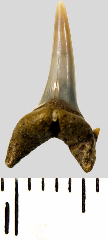 Мелкий боковой зуб с коронкой темно-бежевого цвета, колюще-режущего типа, S-образно изогнутой, с гладким режущим краем. С лингвальной стороны у основания коронки на эмали имеется скульптура в виде слабой продольной струйчатости. Корень бурый, арочный, умеренно массивный, со следами окатанности. Имеется одна питательная борозда с лингвальной стороны корня. Имелась одна пара добавочных зубцов коронки, сохранился только правый.