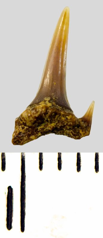 Мелкий боковой зуб с коронкой темно-бежевого цвета, колюще-режущего типа, S-образно изогнутой, с гладким режущим краем. С лингвальной стороны у основания коронки на эмали имеется скульптура в виде слабой продольной струйчатости. Корень бурый, арочный, умеренно массивный, со следами окатанности. Имеется одна питательная борозда с лингвальной стороны корня. Имелась одна пара добавочных зубцов коронки, сохранился только правый.