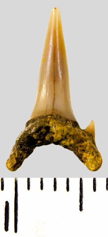 Зуб. Акула. Eostriatolamia subulata (Agassiz, 1843). Классификация: Хордовые Chordata, Позвоночные Vertebrata, Хрящевые рыбы Chondrichthyes, Пластиножаберные Elasmobranchii, Акулы Selachii, Ламнообразные Lamniformes, Песчаные акулы Odontaspididae