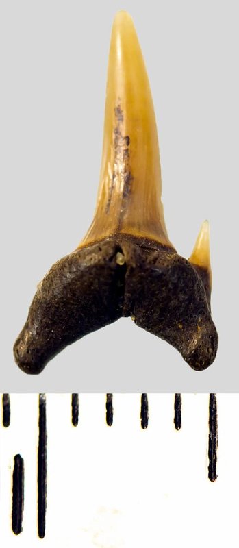 Мелкий боковой зуб с коронкой темно-бежевого цвета, колюще-режущего типа, S-образно изогнутой, с гладким режущим краем. С лингвальной стороны у основания коронки на эмали имеется скульптура в виде слабой продольной струйчатости. Корень бурый, арочный, умеренно массивный, со следами окатанности. Имеется одна питательная борозда с лингвальной стороны корня. Имелась одна пара добавочных зубцов коронки, сохранился только правый.