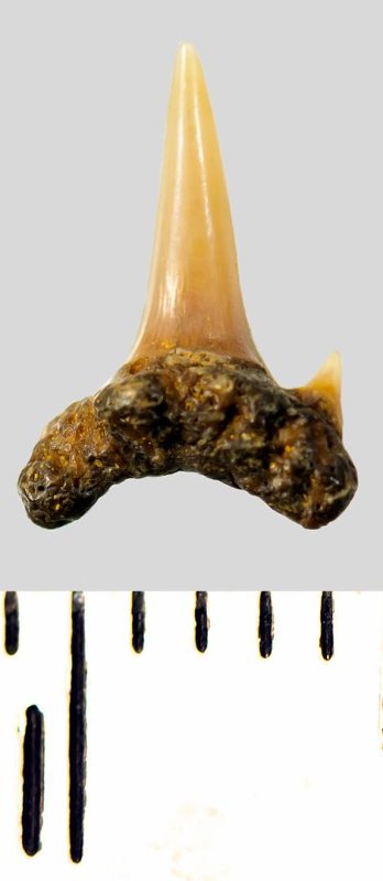 Мелкий боковой зуб с коронкой темно-бежевого цвета, колюще-режущего типа, S-образно изогнутой, с гладким режущим краем. С лингвальной стороны у основания коронки на эмали имеется скульптура в виде слабой продольной струйчатости. Корень бурый, арочный, умеренно массивный, со следами окатанности. Имеется одна питательная борозда с лингвальной стороны корня. Имелась одна пара добавочных зубцов коронки, сохранился только правый.