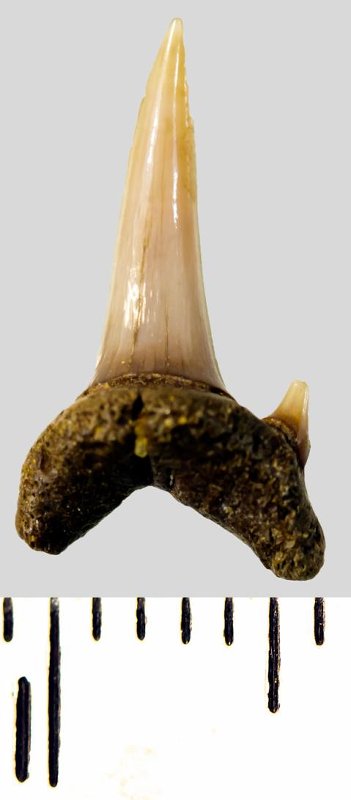 Мелкий боковой зуб с коронкой темно-бежевого цвета, колюще-режущего типа, S-образно изогнутой, с гладким режущим краем. С лингвальной стороны у основания коронки на эмали имеется скульптура в виде слабой продольной струйчатости. Корень бурый, арочный, умеренно массивный, со следами окатанности. Имеется одна питательная борозда с лингвальной стороны корня. Имелась одна пара добавочных зубцов коронки, сохранился только правый.