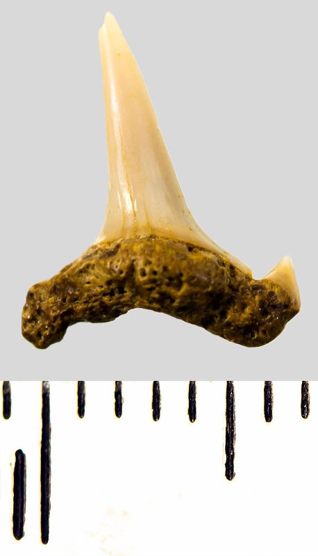 Мелкий боковой зуб с коронкой темно-бежевого цвета, колюще-режущего типа, S-образно изогнутой, с гладким режущим краем. С лингвальной стороны у основания коронки на эмали имеется скульптура в виде слабой продольной струйчатости. Корень бурый, арочный, умеренно массивный, со следами окатанности. Имеется одна питательная борозда с лингвальной стороны корня. Имелась одна пара добавочных зубцов коронки, сохранился только правый.