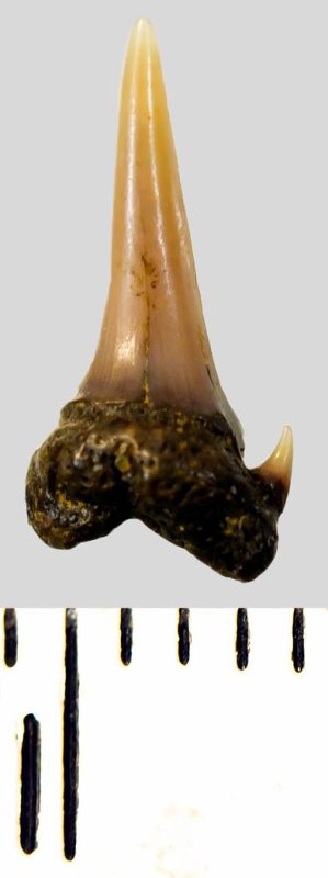 Мелкий боковой зуб с коронкой темно-бежевого цвета, колюще-режущего типа, S-образно изогнутой, с гладким режущим краем. С лингвальной стороны у основания коронки на эмали имеется скульптура в виде слабой продольной струйчатости. Корень бурый, арочный, умеренно массивный, со следами окатанности. Имеется одна питательная борозда с лингвальной стороны корня. Имелась одна пара добавочных зубцов коронки, сохранился только правый.