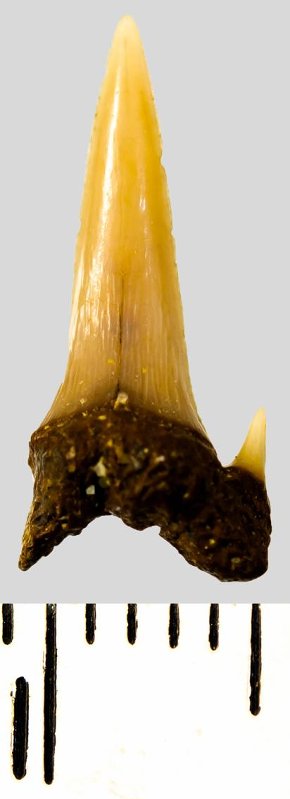 Мелкий боковой зуб с коронкой темно-бежевого цвета, колюще-режущего типа, S-образно изогнутой, с гладким режущим краем. С лингвальной стороны у основания коронки на эмали имеется скульптура в виде слабой продольной струйчатости. Корень бурый, арочный, умеренно массивный, со следами окатанности. Имеется одна питательная борозда с лингвальной стороны корня. Имелась одна пара добавочных зубцов коронки, сохранился только правый.