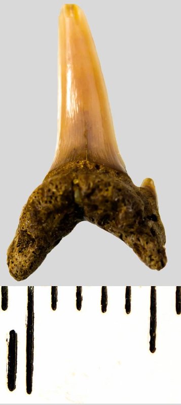 Мелкий боковой зуб с коронкой темно-бежевого цвета, колюще-режущего типа, S-образно изогнутой, с гладким режущим краем. С лингвальной стороны у основания коронки на эмали имеется скульптура в виде слабой продольной струйчатости. Корень бурый, арочный, умеренно массивный, со следами окатанности. Имеется одна питательная борозда с лингвальной стороны корня. Имелась одна пара добавочных зубцов коронки, сохранился только правый.