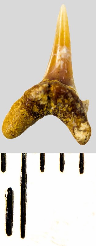 Мелкий боковой зуб с коронкой темно-бежевого цвета, колюще-режущего типа, S-образно изогнутой, с гладким режущим краем. С лингвальной стороны у основания коронки на эмали имеется скульптура в виде слабой продольной струйчатости. Корень бурый, арочный, умеренно массивный, со следами окатанности. Имеется одна питательная борозда с лингвальной стороны корня. Имелась одна пара добавочных зубцов коронки, сохранился только правый.