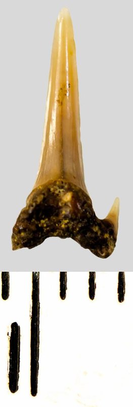 Мелкий боковой зуб с коронкой темно-бежевого цвета, колюще-режущего типа, S-образно изогнутой, с гладким режущим краем. С лингвальной стороны у основания коронки на эмали имеется скульптура в виде слабой продольной струйчатости. Корень бурый, арочный, умеренно массивный, со следами окатанности. Имеется одна питательная борозда с лингвальной стороны корня. Имелась одна пара добавочных зубцов коронки, сохранился только правый.