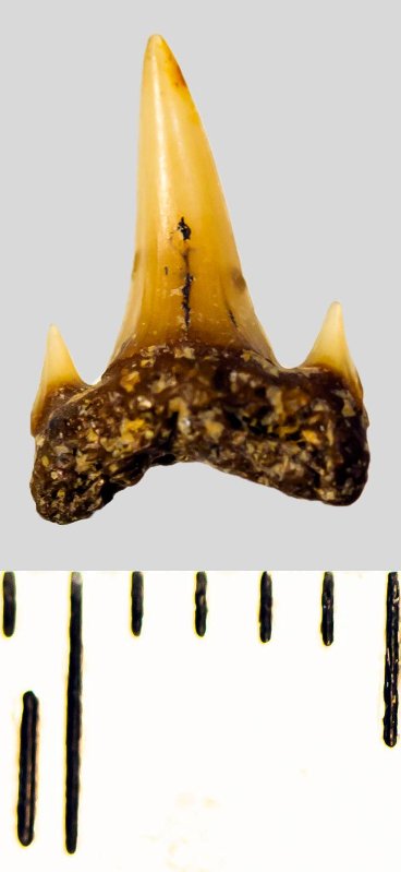 Мелкий боковой зуб с коронкой рыжевато-коричневого цвета, колюще-режущего типа, S-образно изогнутой, с гладким режущим краем. С лингвальной стороны у основания коронки на эмали имеется скульптура в виде слабой продольной струйчатости. Корень охристый, арочный, умеренно массивный, со следами окатанности. Имеется одна питательная борозда с лингвальной стороны корня и одна пара добавочных зубцов коронки.