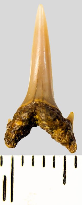 Мелкий боковой зуб с коронкой рыжевато-коричневого цвета, колюще-режущего типа, S-образно изогнутой, с гладким режущим краем. С лингвальной стороны у основания коронки на эмали имеется скульптура в виде слабой продольной струйчатости. Корень охристый, арочный, умеренно массивный, со следами окатанности. Имеется одна питательная борозда с лингвальной стороны корня и одна пара добавочных зубцов коронки.